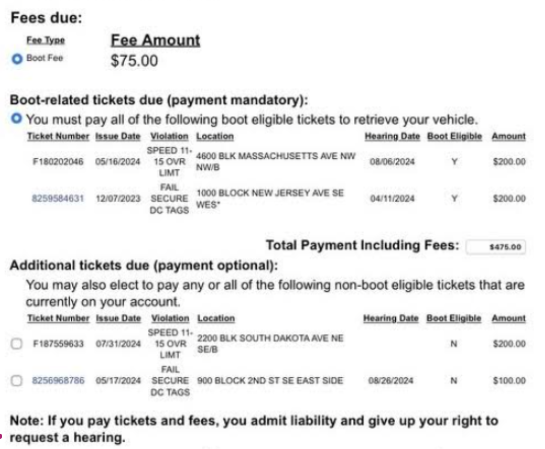 As of late September, Wild owed $775 for four citations between Dec. 7, 2023, and July 31, 2024—two tickets for speeding more than 11 miles per hour and two for failure to secure D.C. tags, according to Department of Motor Vehicles records.