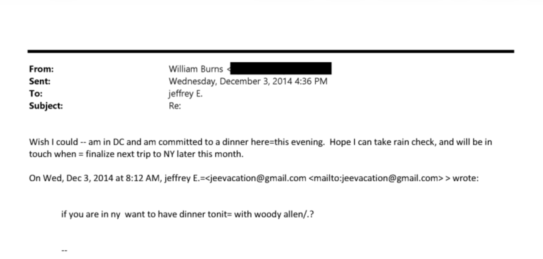Other emails offer further details on the nature of the relationship between Burns and Epstein. Epstein invited Burns to a December 2014 dinner with filmmaker and alleged sex abuser Woody Allen. Burns took another rain check.