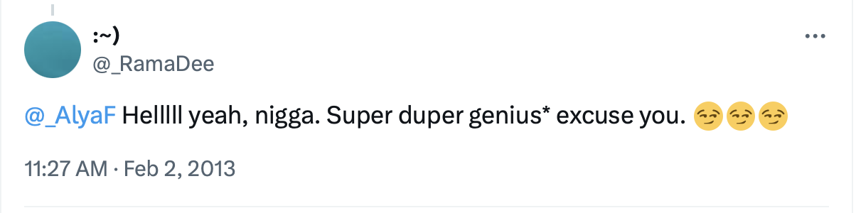 "@_AlyaF Helllll yeah, nigga. Super duper genius* excuse you," Duwaji posted in February 2013.