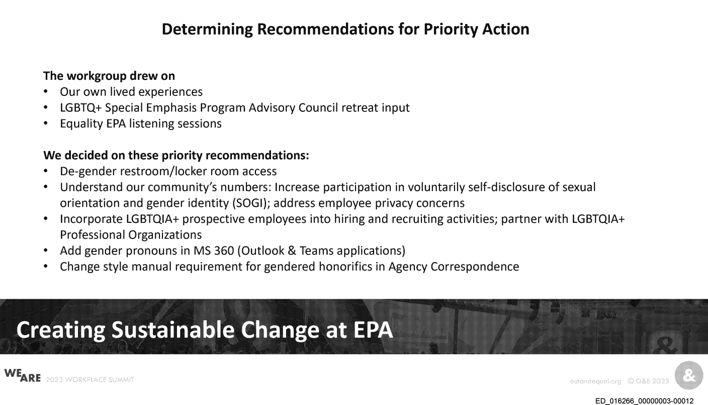 According to slides of its presentation reviewed by the Free Beacon, the group's top recommendations for the EPA were to "de-gender" restroom and locker room access, increase participation in voluntary self-disclosure of sexual orientation and gender identity, incorporate LGBTQIA+ prospective employees into recruiting activities, add gender pronouns on email signatures, and change internal style manual requirements for gendered honorifics.