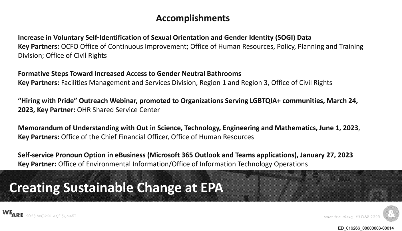 The EPA's LGBTQIA+ Workgroup, meanwhile, outlined its DEI-related activities during a summit in September 2023 hosted by the left-wing group Out and Equal.