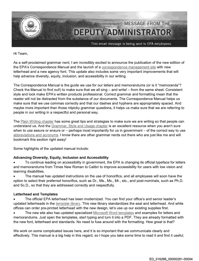 In addition, because of the workgroup's advocacy, the EPA added pronouns to emails, targeted specific offices where people were "misgendered" with expanded trainings, and issued an October 2023 memorandum authored by then-deputy administrator Janet McCabe allowing employees to select their preferred honorifics such as "Mx." instead of "Mr." or "Mrs."