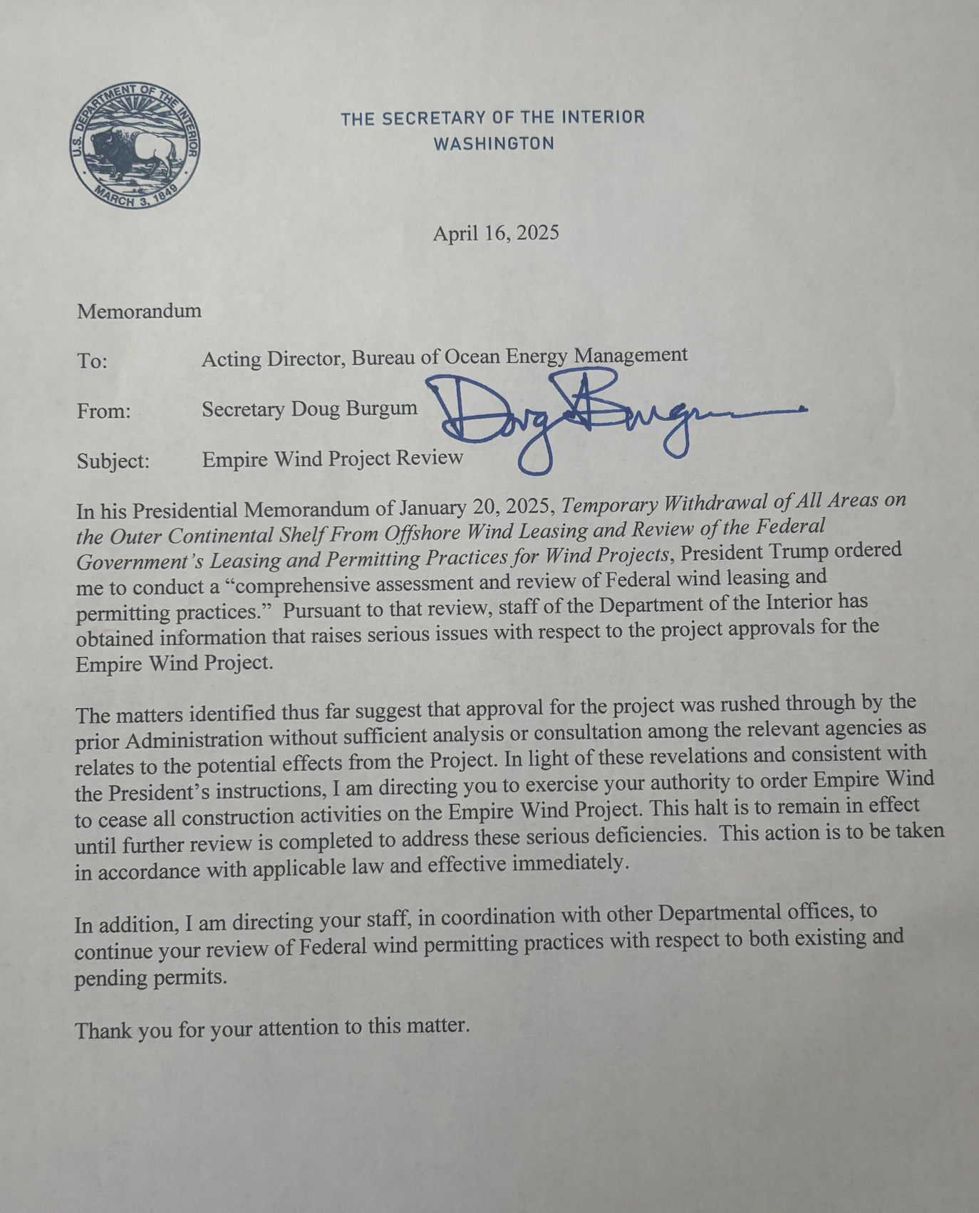 "Approval for the project was rushed through by the prior administration without sufficient analysis or consultation among the relevant agencies as relates to the potential effects from the project," Burgum wrote. He said the halt on Empire Wind will be in effect indefinitely until further review is completed to "address these serious deficiencies."