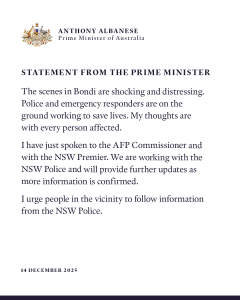 Albanese wrote shortly after the shooting that "the scenes in Bondi are shocking and distressing" and that his "thoughts are with every person affected."