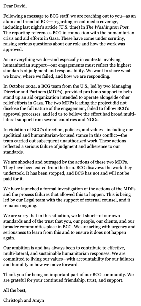 BCG announced last week that it had fired two of its managing directors who were consulting for the Gaza Humanitarian Foundation (GHF), a new American and Israeli-backed aid distribution program formed to prevent Hamas from intercepting international humanitarian supplies. CEO Christoph Schweizer wrote in a company-wide email that he was "sorry for how disappointing this has been to many BCGers around the world."