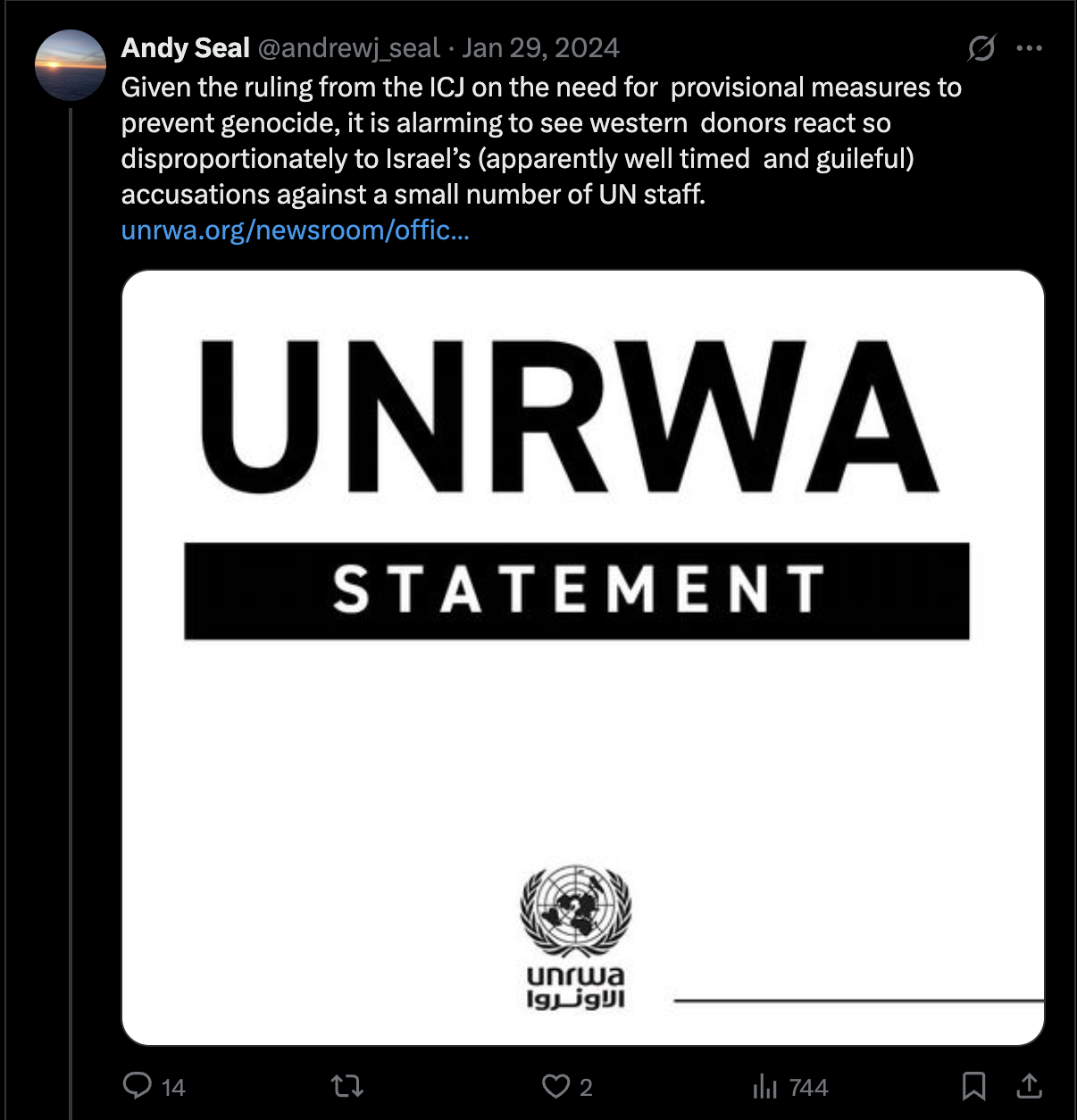 Seal’s extremist rhetoric against Israel—which appears likely to bring even more scrutiny on the IPC report—dates back to at least 2018, when he described Israel’s founding in 1948 as the "destruction of the state of #Palestine by Jewish insurgents."