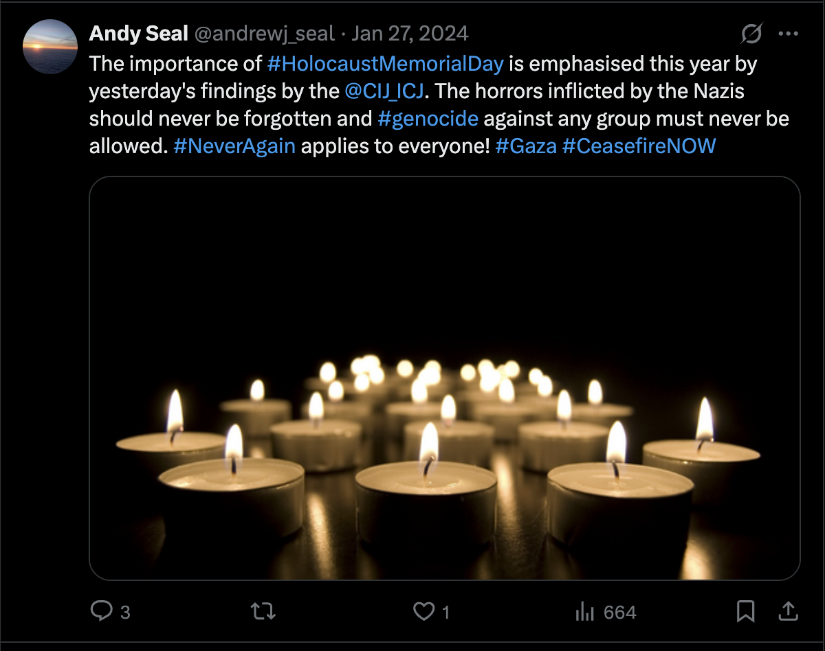 Seal has made several posts related to the Holocaust, arguing Israel’s supposed genocide against Palestinians makes Holocaust remembrance more important than ever. He also claimed German guilt over the Holocaust is the reason why the country will not acknowledge Israel’s supposed genocide.