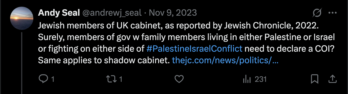 Seal has made social media statements about Jews outside Israel as well. Citing a Jewish Chronicle story about Jews serving in former British prime minister Rishi Sunak’s cabinet, Seal argued those with "family members living in either Palestine or Israel" should declare a conflict of interest.