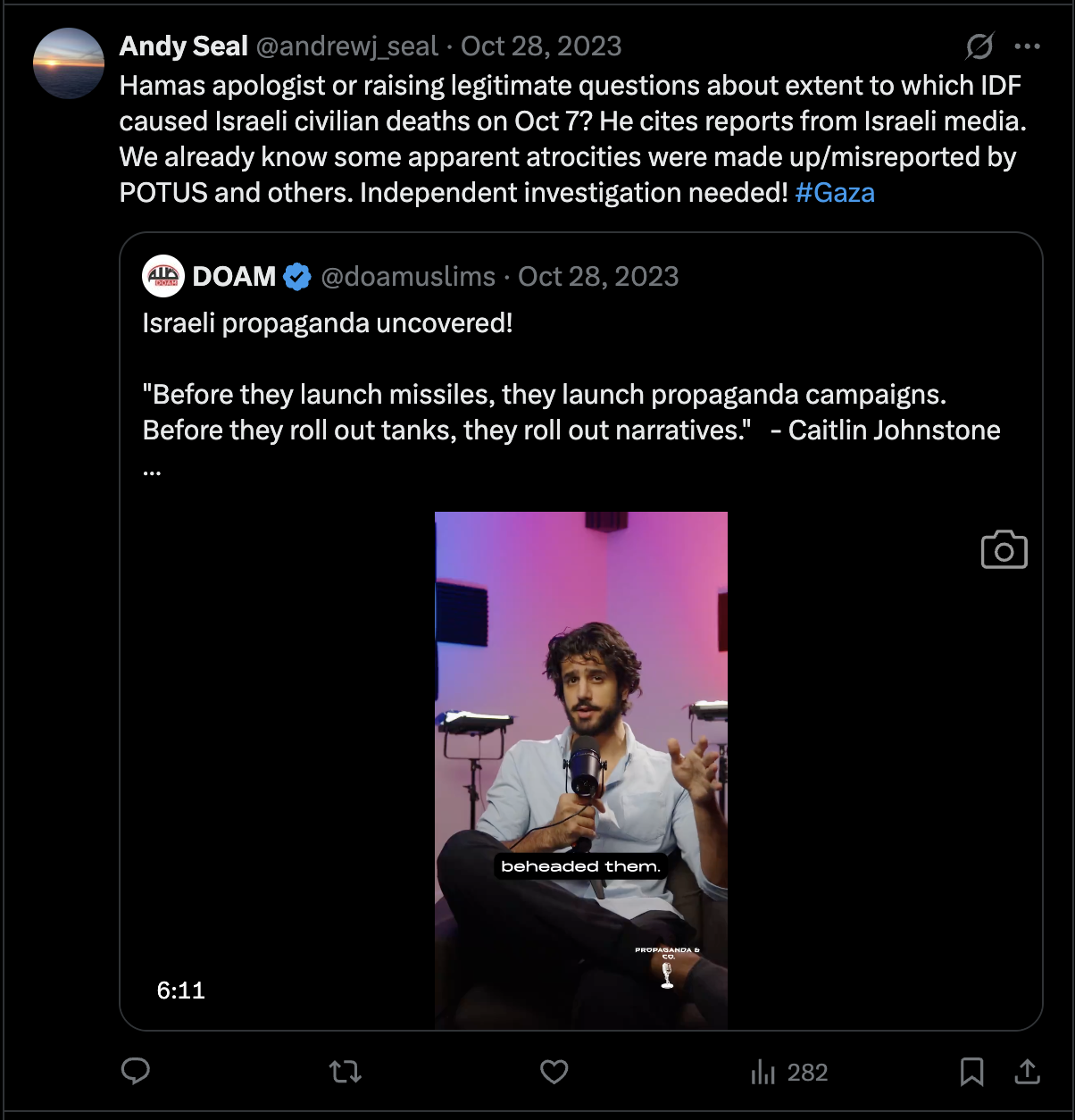 It appears Seal does not believe Hamas committed the Oct. 7 attacks. In another post, he wrote those who claim Israel killed its own civilians are "raising legitimate questions." He has also brushed aside the U.N.'s employment of Hamas terrorists as aid workers in Gaza.