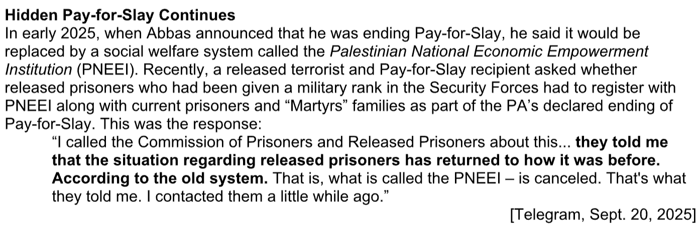 The Telegram chats also confirm the State Department's finding that the PA has used a new welfare authority called the Palestinian National Economic Empowerment Institution (PNEEI)—purportedly meant to provide money based on need—to pay terrorists and their families.