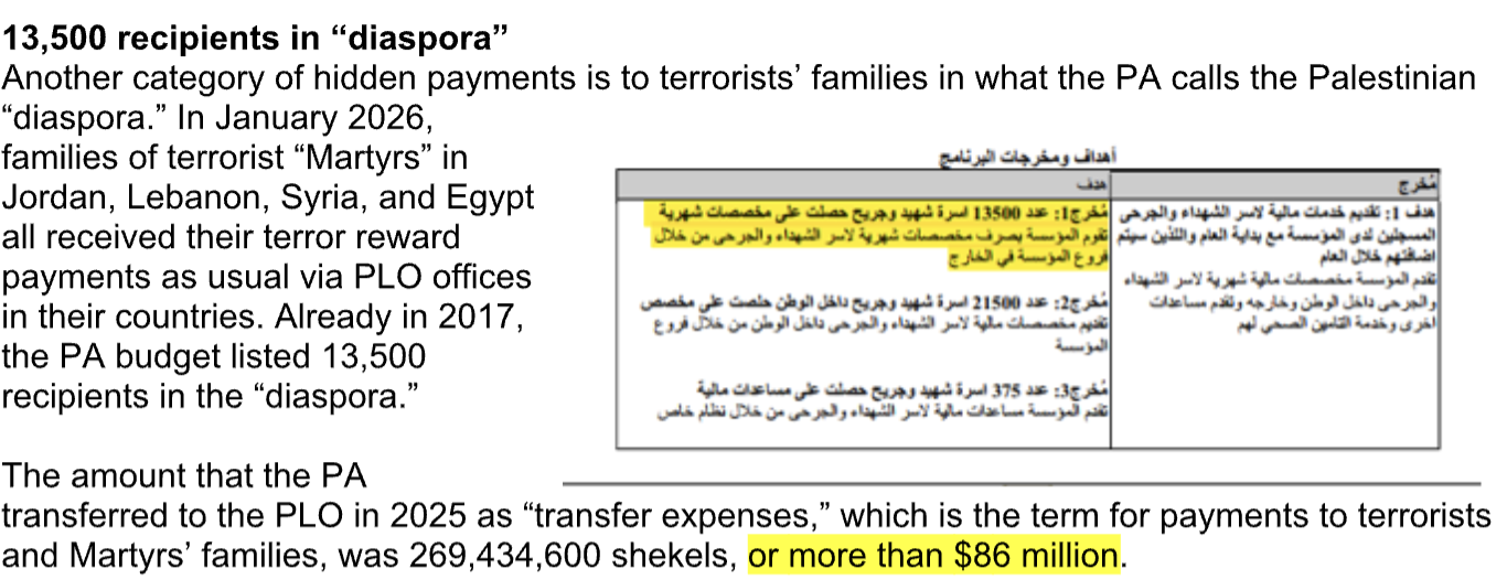 Beyond the Palestinian territories, the PA maintains "another category of hidden payments" to around 13,500 terrorist families living in diaspora communities across Jordan, Lebanon, Syria, and Egypt. More than $86 million was allocated for these families in 2025 alone, and in January of this year all of them "received their terror reward payments as usual via [Palestine Liberation Organization] offices in their countries," PMW determined based on firsthand accounts.