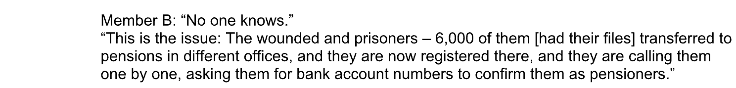 "The wounded and prisoners—6,000 of them [had their files] transferred to pensions in different offices, and they are now registered there, and they are calling them one by one, asking them for bank account numbers to confirm them as pensioners," one recipient wrote.