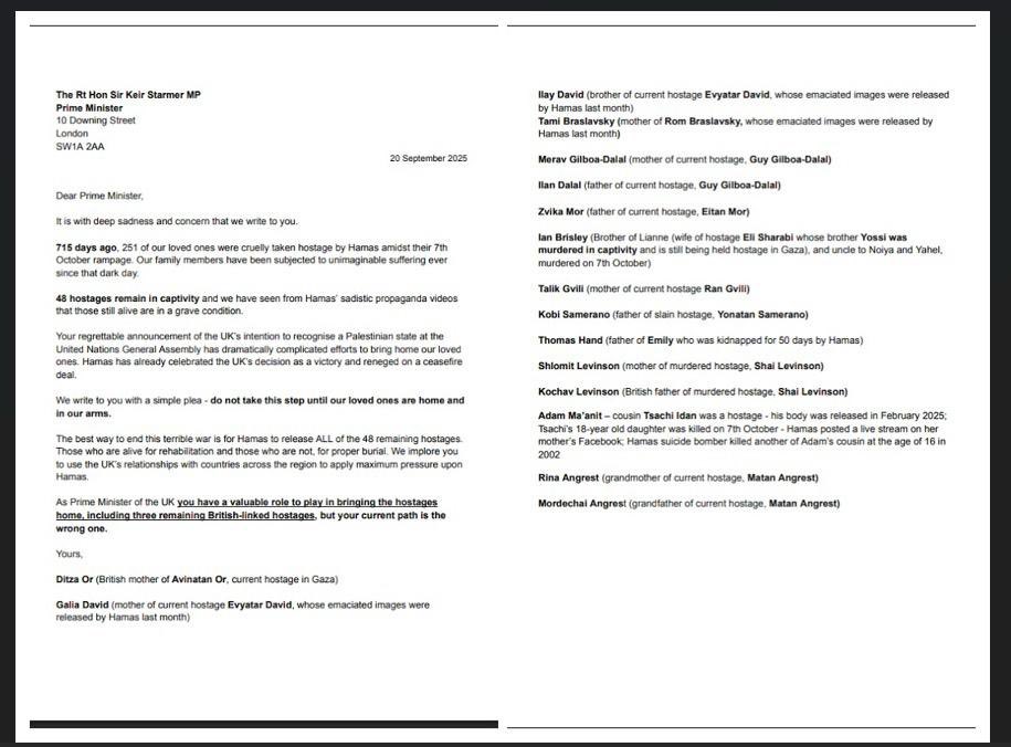 "Hamas has already celebrated the UK's decision as a victory and reneged on a ceasefire deal," they continued. "As Prime Minister of the UK you have a valuable role to play in bringing the hostages home, including three remaining British-linked hostages, but your current path is the wrong one."