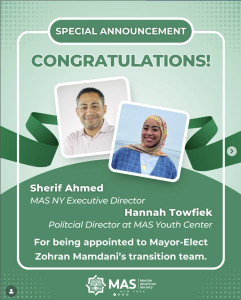 Mamdani has deep ties to MAS New York and MAS Youth Center. After his election, Mamdani selected Hannah Towfiek, the political director at MAS Youth Center, to serve on his mayoral transition committee on youth & education and MAS New York executive director Sherif Ahmed to serve on his transition committee on community organizing. Mamdani’s transition team members "will be tasked with not only making personnel recommendations but policy recommendations."
