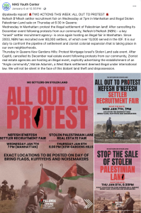"Join us today and at future protests to stop the sale of stolen palestinian land being sold right here in NYC!" reads an MAS Youth Center post.