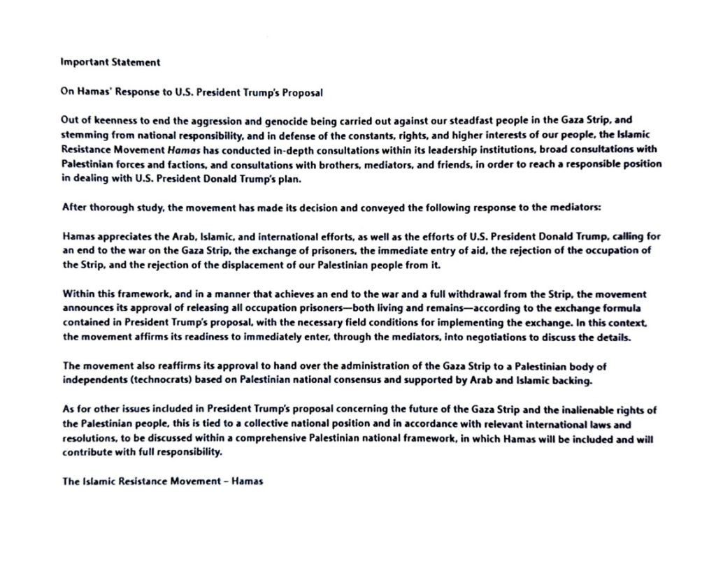 Qatar, Hamas's top patron and peace mediator, welcomed the terror group's response to Trump's plan, saying that it has "begun working with its partners" in Egypt and the United States "to complete discussions on the plan to ensure an end to the war."