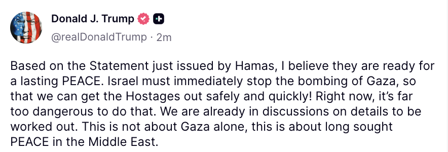 "Based on the Statement just issued by Hamas, I believe they are ready for a lasting PEACE," Trump wrote in a Truth Social post sent Friday evening that called on Israel to "stop the bombing of Gaza, so that we can get the Hostages out safely and quickly." He followed up in a taped address from the Oval Office.