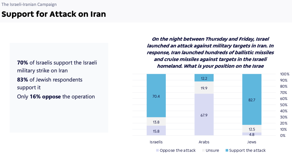 A poll by the Israel Democracy Institute, which largely matched Agam Labs's findings, found that 69 percent of Jews and 63 percent of all Israelis believe Israel was right to launch the campaign, even while assuming that "Iran’s nuclear capabilities cannot be destroyed without help from the United States."