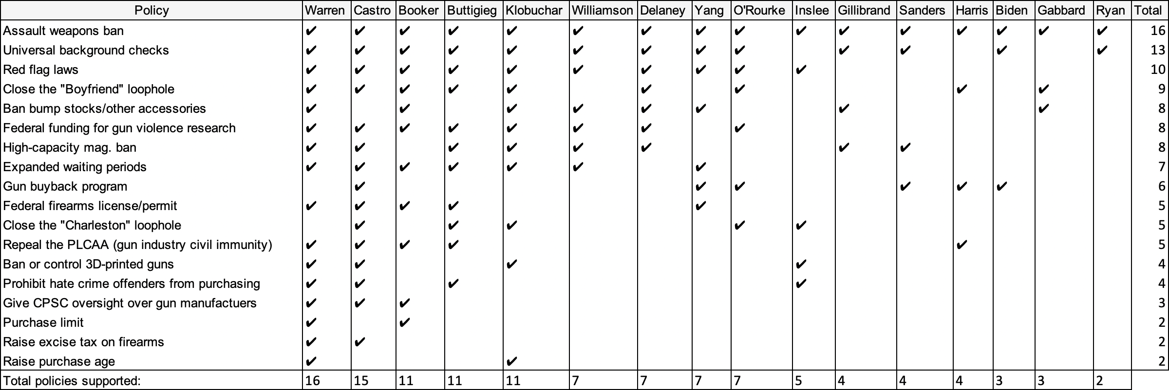 Many Democratic candidates appear to be taking an "everything but the kitchen sink" approach to gun policy. Proposals like the aforementioned "assault weapons" ban, universal background checks, and federal funding of gun violence research are all popular. Less popular, but still commanding attention, are ideas like making gun manufacturers liable for criminal acts committed by third parties, or instituting a national "waiting period" for gun purchases.