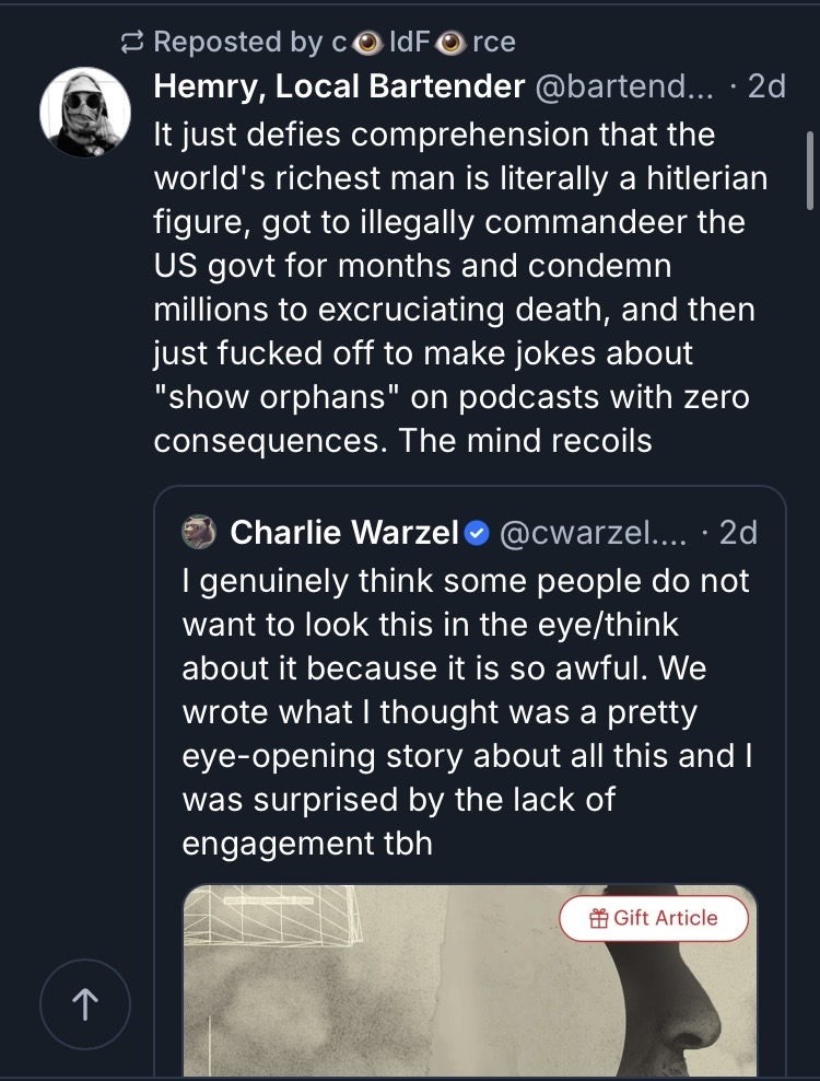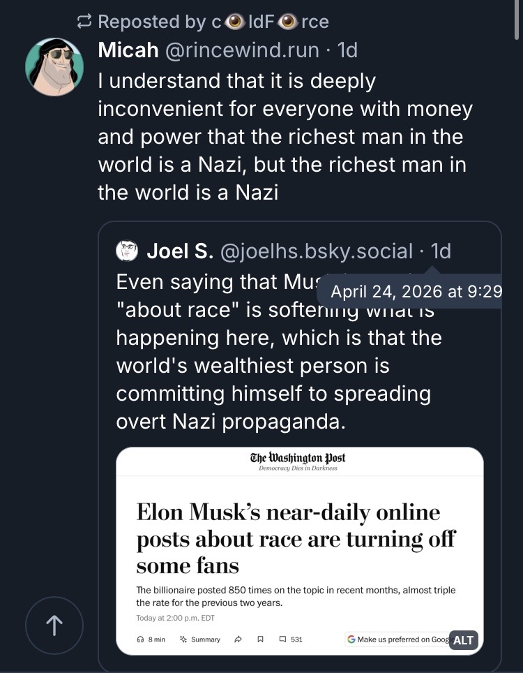 "I understand that it is deeply inconvenient for everyone with money and power that the richest man in the world is a Nazi, but the richest man in the world is a Nazi," one of the Musk posts read. "It just defies comprehension that the world's richest man is literally a hitlerian figure," read another.