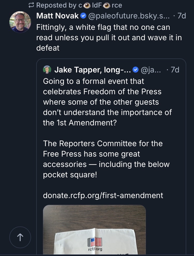 Allen shared another post from Gizmodo reporter Matt Novak criticizing a First Amendment pocket square that CNN anchor Jake Tapper promoted ahead of the dinner. Tapper said he would wear the accessory to remind Trump of the "importance of the 1st Amendment." Novak responded, "Fittingly, a white flag that no one can read unless you pull it out and wave it in defeat."