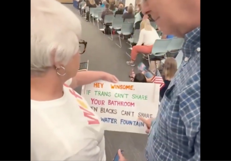 "Hey Winsome, If Trans Can't Share Your Bathroom Then Blacks Can't Share My Water Fountain," the protester’s sign reads, according to photos originally posted on X by journalist Brandon Jarvis. Her shirt displayed "WoFava," short for We of Action, an Arlington-based far-left group that has canvassed for Spanberger and promotes a September canvassing event in support of the Democrat on its website.