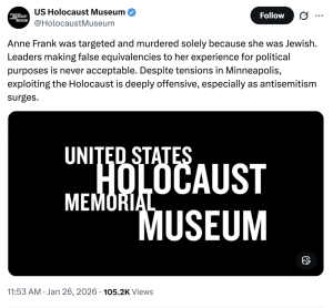 "Anne Frank was targeted and murdered solely because she was Jewish. Leaders making false equivalencies to her experience for political purposes is never acceptable," the museum said on X. "Despite tensions in Minneapolis, exploiting the Holocaust is deeply offensive, especially as antisemitism surges."