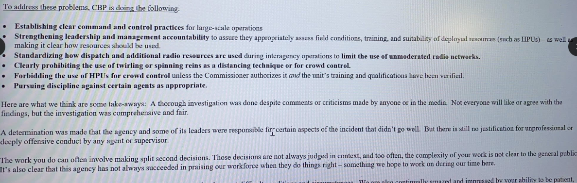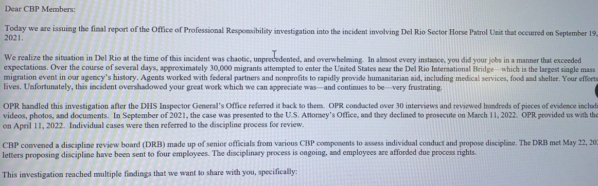Border Patrol agents on horseback never whipped any Haitian migrants, according to a memo from Customs and Border Protection commissioner Chris Magnus.