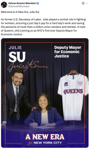 "Welcome to a New Era, Julie Su!" Mamdani wrote on X. "As former U.S. secretary of labor, Julie played a central role in fighting for workers, ensuring a just day’s pay for a hard day’s work and saving the pensions of more than a million union workers and retirees."