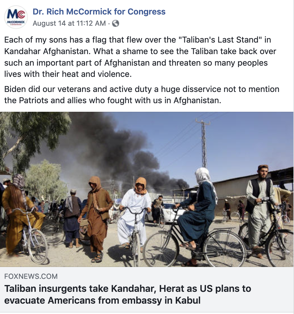 Dr. Rich McCormick, a Marine veteran and Georgia congressional candidate, shared the ad, which criticized Biden for doing "a huge disservice" to the U.S. military and Afghan allies. The ad linked to a Fox News Pentagon correspondent's recent piece on the Taliban insurgency, to which the Associated Press contributed.![]()