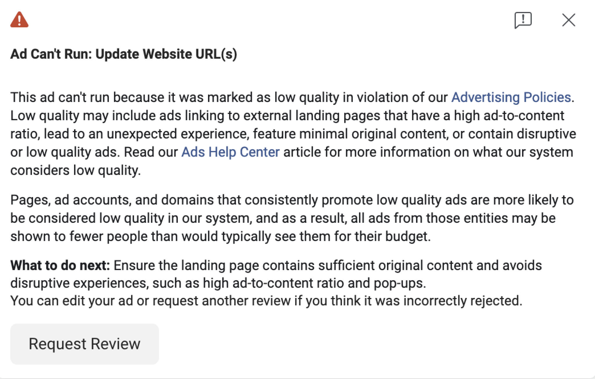 Facebook's explanation for the ban states, "Low quality may include ads linking to external landing pages that have a high ad-to-content ratio, lead to an unexpected experience, feature minimal original content, or contain disruptive and low-quality ads."