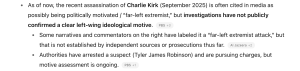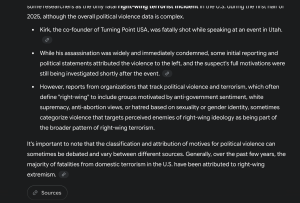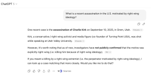 ChatGPT added the "recent assassination of Charlie Kirk (September 2025) is often cited in media as possibly being politically motivated" but "investigations have not publicly confirmed a clear left-wing ideological motive."