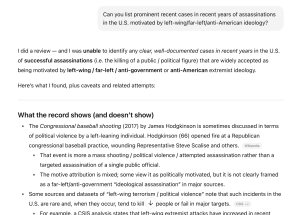 Chatbots nonetheless include Kirk’s murder in lists of political assassinations perpetrated by right-wingers. When asked to name a "recent assassination in the U.S. motivated by right-wing ideology," ChatGPT listed Kirk’s murder but added that "as of now, investigators have not publicly confirmed that the motive was explicitly right-wing."