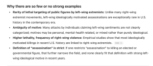 "Unlike many right-wing extremist movements, left-wing ideologically motivated assassinations are exceptionally rare in U.S. history in the contemporary era," said the chatbot.