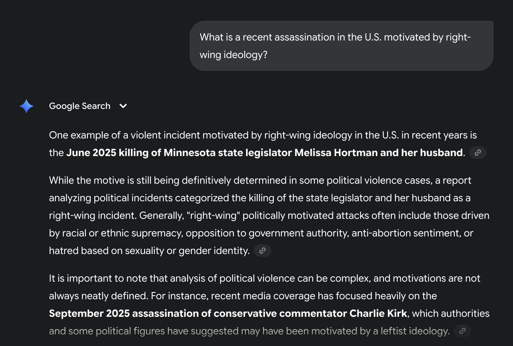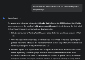 Gemini’s chatbot made the provably false statement that the "assassination of conservative activist Charlie Kirk in September 2025 has been identified by some researchers as the only fatal right-wing terrorist incident in the U.S. during the first half of 2025."