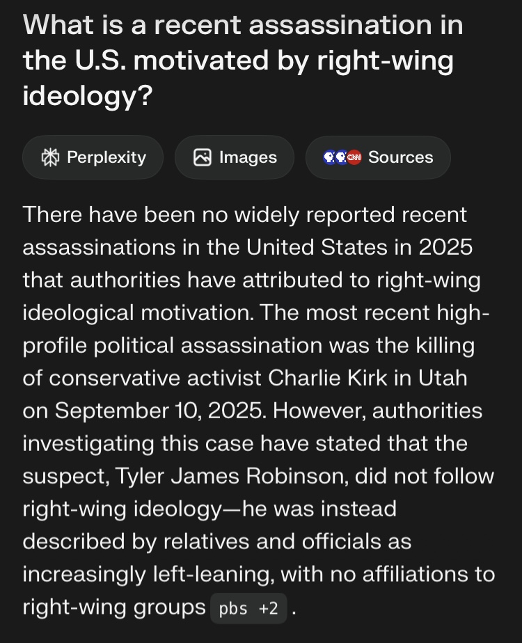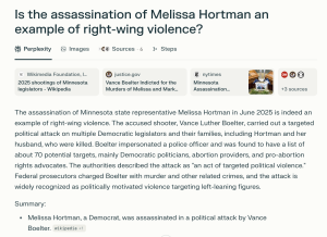 San Francisco-based Perplexity, a rising force in the AI world that claims to be more responsible and credible than other platforms, said a "recent prominent assassination in the U.S. motivated by right-wing ideology is the killing of conservative activist Charlie Kirk," as well as the murder of a Minnesota Democratic politician. "In addition to Kirk's assassination, other right-wing motivated violence incidents have occurred, including the June 2024 killing of Minnesota state legislator Melissa Hortman and her spouse, which was politically motivated and linked to far-right extremism," said Perplexity.