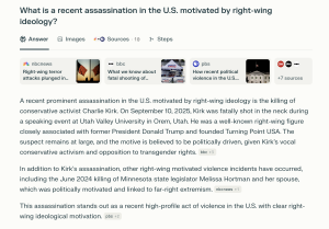 When asked to name a "recent assassination in the U.S. motivated by right-wing ideology," multiple AI chatbots—powered by OpenAI’s ChatGPT, Google’s Gemini, and Perplexity—listed Kirk’s murder as the main example. Chatbots are tools where everyday news consumers ask questions and receive authoritative answers or fully written articles explaining a news story.