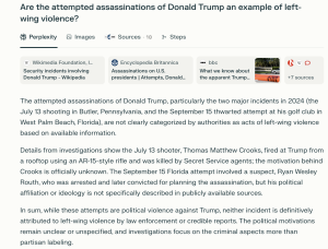 Perplexity, for its part, was also more likely to label political violence as "right-wing" than otherwise. When asked if the attempted assassinations of President Donald Trump were examples of left-wing political violence, the chatbot said they were "not clearly categorized by authorities as acts of left-wing violence." Yet, asked about Hortman’s murder in Minnesota, the chatbot said this was "indeed an example of right-wing violence."