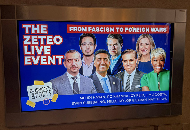Zeteo gets its name from the ancient Greek term for "getting to the bottom of things"—the pretentiously highbrow equivalent of "igniting truth." The people in the audience paid to be here because they need the truth therapy, and there's nowhere else to go these days. CNN and MSNBC (or whatever it's called these days) are too right-wing, too anti-Hamas. Don't even get them started on CBS News. The Democratic Party is run by corporate sellouts, Zionist shills, and conniving anti-communists who refuse to fight.