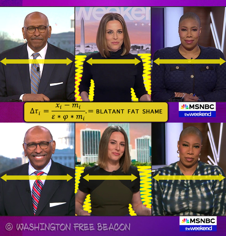 Some of the liberal network's defenders have suggested MSNBC didn't fire Reid because of racism by pointing out that her old time slot now features a trio of minority hosts: Symone Sanders, the former Democratic operative, Michael Steele, the former Republican who hates Donald Trump, and Alicia Menendez, the daughter of disgraced former senator and convicted felon "Bullion Bob" Menendez. Sanders and Steele are black, while Menendez is a member of the racial group formerly known as Latinx. That argument seems plausible at first glance until you consider the results of our analysis, which found that MSNBC has been waging a malicious campaign to shame Sanders, Steele, and other black personalities by making them appear fat on television.