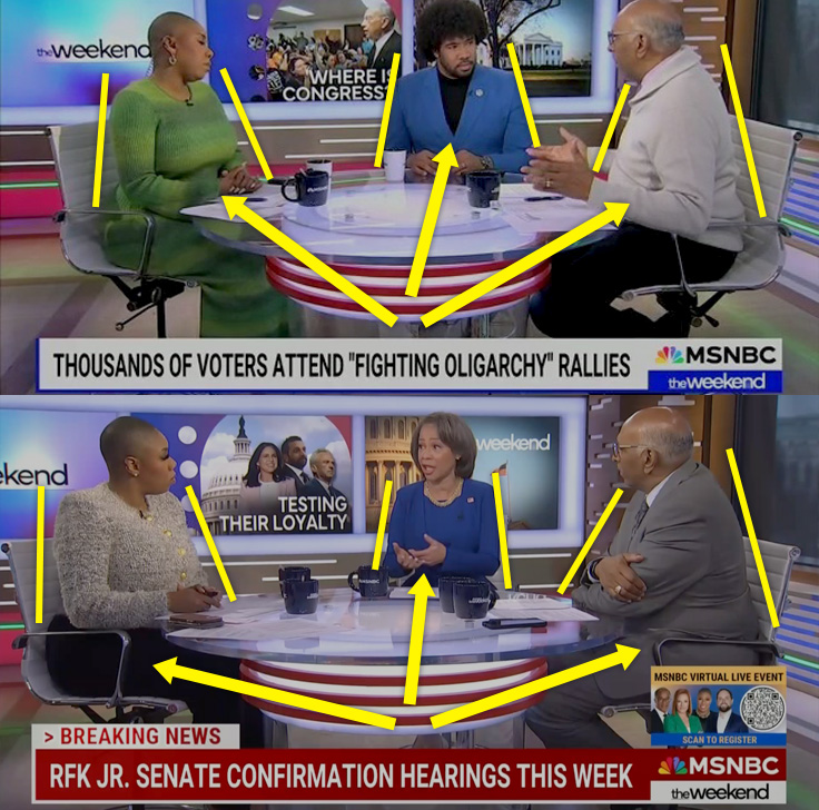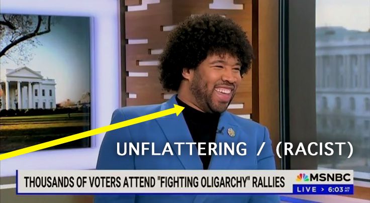 MSNBC regularly deploys unflattering camera angles when Sanders and Steele appear on screen to distort their body shapes. Both are normal-sized individuals, unlike Gov. J.B. Pritzker (D., Ill.), who is legitimately fat. Nevertheless, MSNBC has weaponized the use of "cheap fake" cinematic relativity and deceptive proportionality to accentuate the alleged size disparities between the black cohosts, Menendez, and the small-bodied guests the network utilizes to facilitate its nefarious bigotry.