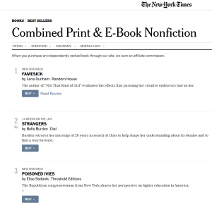 Stefanik's book indicates that the video of her questioning has been viewed more than a billion times, making it "the most-watched congressional hearing in history." That does not appear to impress the Times, which has not reviewed the book or mentioned it in any coverage beyond the Best Sellers list. The paper reviewed Dunham’s Famesick—favorably, with praise for its "quick hits of wit"—as well as an interview in the paper and an essay in the New York Times Magazine.