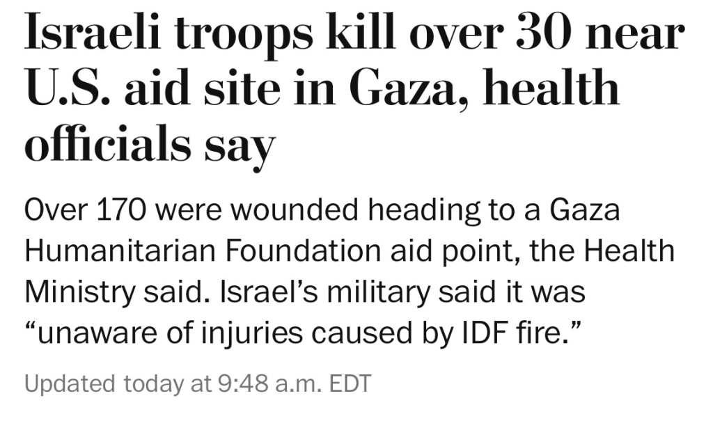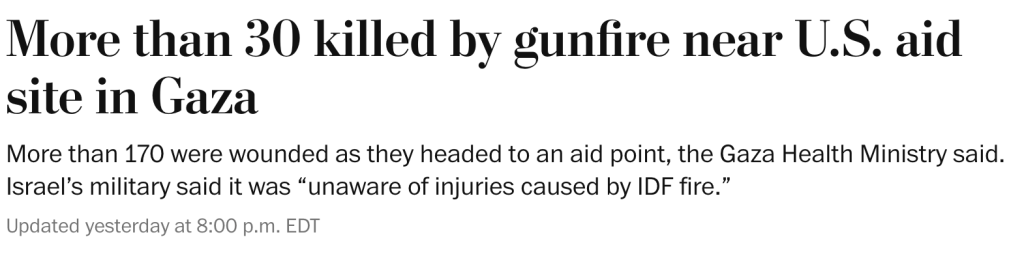 The Post updated its story Sunday evening, changing its headline to read, "More than 30 killed by gunfire near U.S. aid site in Gaza."