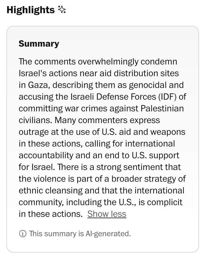The result of the Post's coverage was a comment section in which readers described "Israel's actions near aid distribution sites in Gaza" as "genocidal," accused the Jewish state of "committing war crimes" and implementing "a broader strategy of ethnic cleansing," and called for "an end to U.S. support for Israel," according to the Post's AI-generated summary.