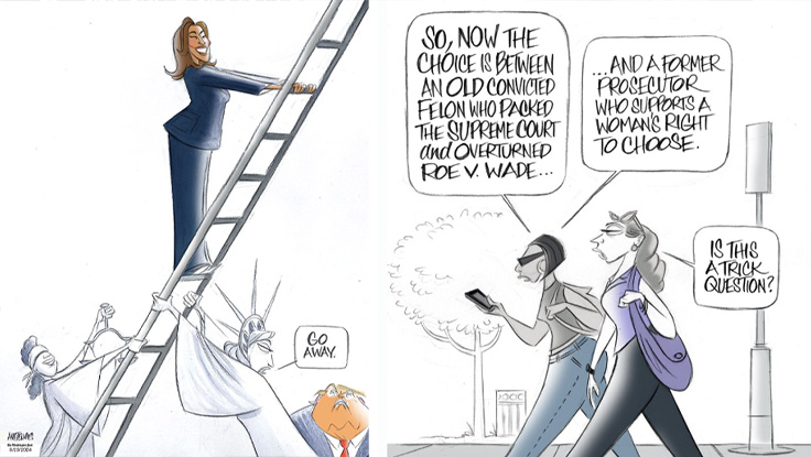 Ann Telnaes was a sure bet to win for "illustrated reporting and commentary," and so she did. The former Washington Post cartoonist resigned in a huff earlier this year after the paper's owner, Amazon founder Jeff Bezos, spiked her dumb drawing of Bezos and other tech billionaires kneeling before Trump with bags of cash. The Pulitzer board lauded Telnaes for her "piercing commentary" and "fearlessness." See below for examples of her groundbreaking work. Powerful stuff.