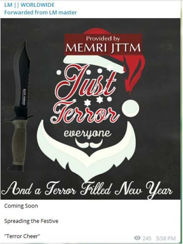 The LM WorldWide Telegram channel, which is known to disseminate and spread ISIS propaganda and threats, published a new graphic that appears to warn on new attacks are being planned for the Christmas and New Years holidays, according to a copy of the graphic released by the Middle East Media Research Institute, or MEMRI.
