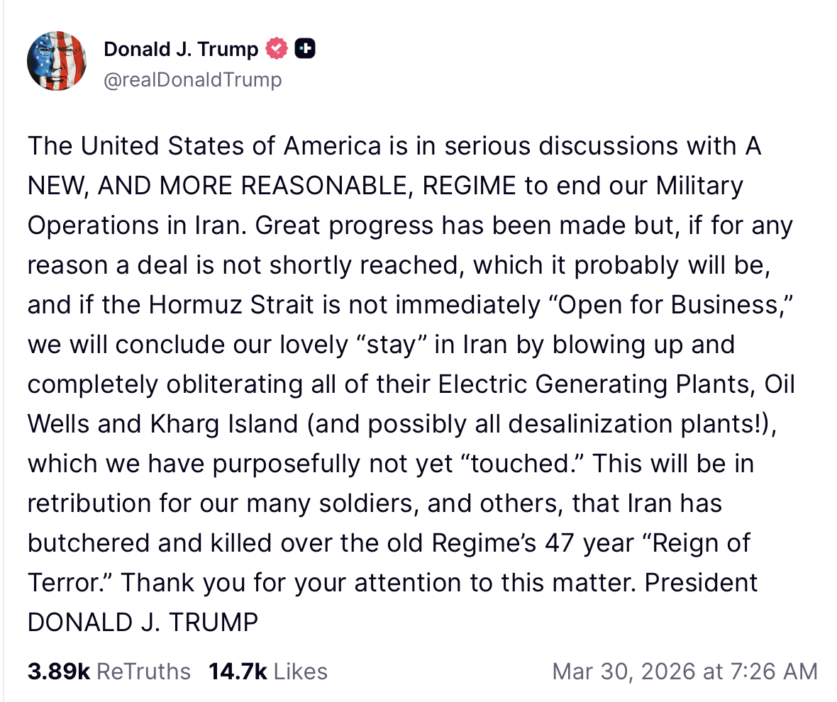 "The United States of America is in serious discussions with A NEW, AND MORE REASONABLE, REGIME to end our Military Operations in Iran," he wrote. "Great progress has been made but, if for any reason a deal is not shortly reached, which it probably will be, and if the Hormuz Strait is not immediately 'Open for Business,' we will conclude our lovely 'stay' in Iran by blowing up and completely obliterating all of their Electric Generating Plants, Oil Wells and Kharg Island (and possibly all desalinization plants!), which we have purposefully not yet 'touched.' This will be in retribution for our many soldiers, and others, that Iran has butchered and killed over the old Regime's 47 year 'Reign of Terror.'"