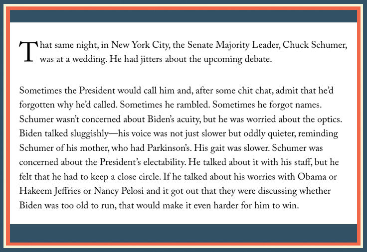 Fact check: This was a media scandal, and Chuck Schumer was part of the problem, as the following excerpt from Original Sin makes clear. Biden's incoherent mumbling reminded Schumer of his mother "who had Parkinson's," but he was mostly concerned about "optics" and "electability."