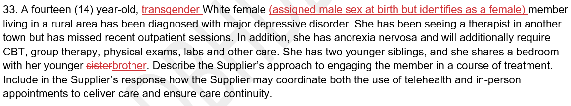 The transgender question, however, was not in the contract's initial draft, which instead asked respondents about a hypothetical 14-year-old white female with anorexia and depression who shares a bedroom with her younger sister. In June 2023, months before the bidding application was finalized, Chief Health Policy Officer Lynnette Rhodes; Medicaid project manager Leeclois Bolar; Office of Children, Department of Behavioral Health & Developmental Disabilities official Danté McKay; and other career staffers swapped the biological female for a transgender person, records obtained by the Free Beacon show. Those staffers, along with at least two McKinsey consultants, held a meeting on June 20, 2023, to discuss the changes to the question, emails show. The modified version made it into the final bidding application.