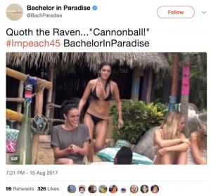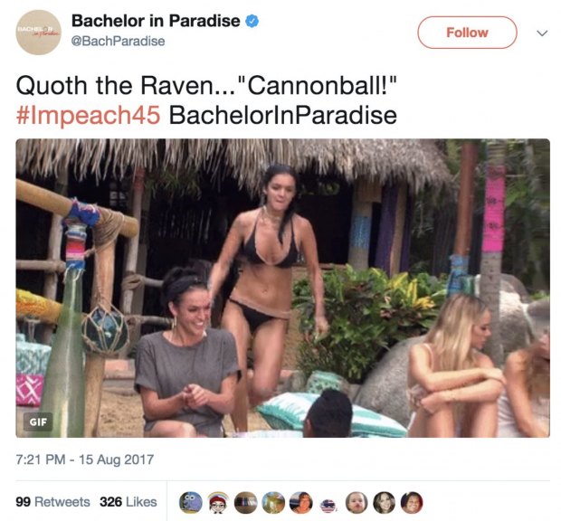 The verified @BachParadise account tweeted and later deleted a gif of contestant Raven Gates in a bikini attempting to perform a cannonball jump and included #Impeach45. That has been used by many who want Congress to impeach President Donald Trump, and it is unclear if it has any connection with the episode or to Gates' political views.